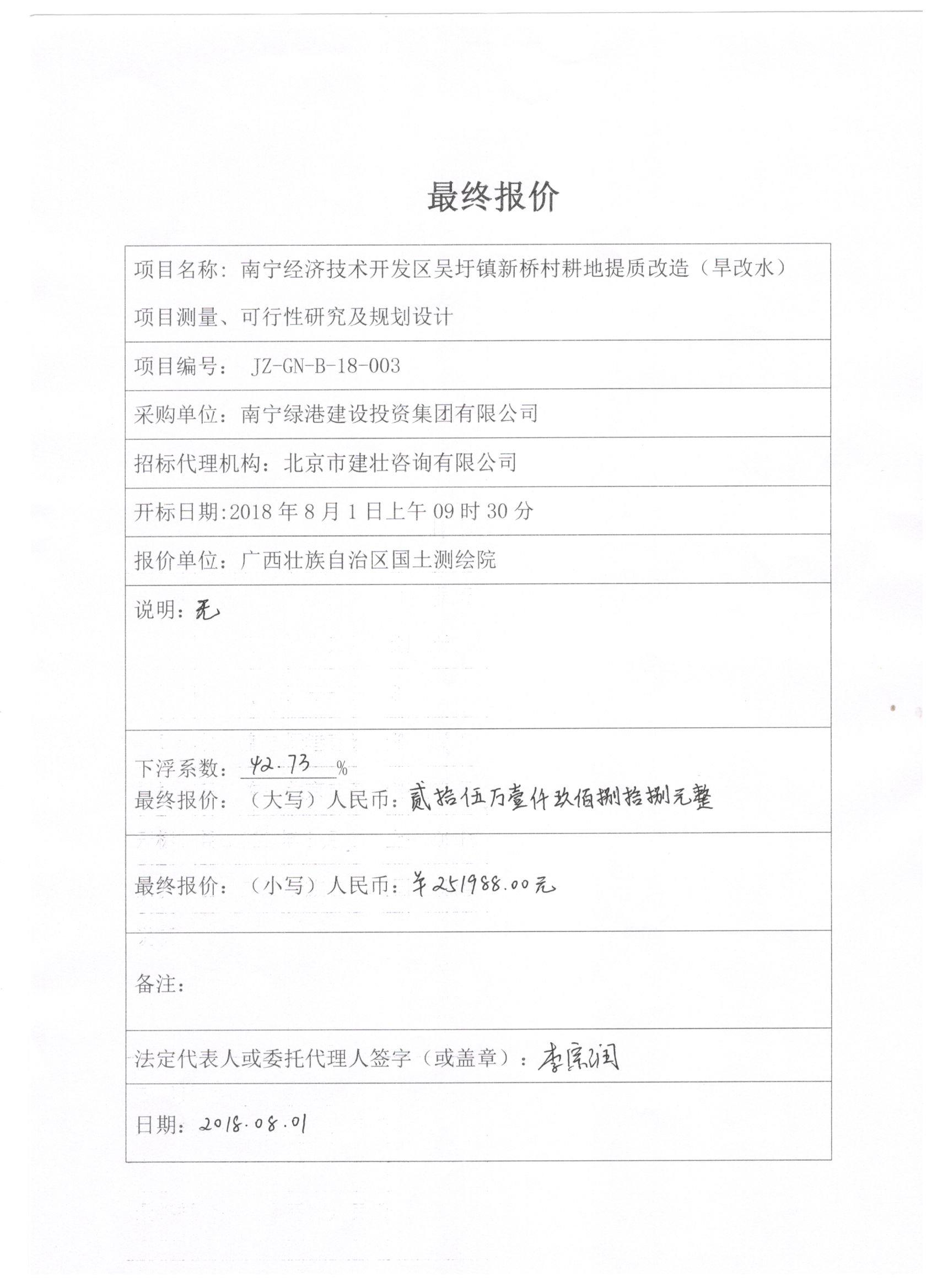 北京市建壯咨詢有限公司受南寧綠港建設投資集團有限公司委托,根據(jù)《中華人民共和國政府采購法》等有關規(guī)定,于2018年8月1日就南寧經(jīng)濟技術開發(fā)區(qū)吳圩鎮(zhèn)新橋村耕地提質改造(旱改水)項目測量、可行性研究及規(guī)劃設計以競爭性磋商方式進行采購,現(xiàn)就本次采購的成交結果公告如下: