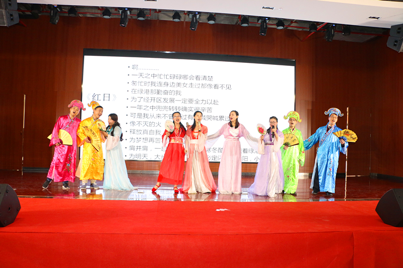 隨后,來自集團工程管理部林重胤以及嘉通公司潘青青甜蜜獻唱《告白氣球》,讓大家感受到了愛情的絲絲美好。嘉通公司的《夸夸咱公司》,用三句半的表演形式唱出了綠港集團濃濃的企業(yè)文化情愫,也展現(xiàn)了綠港員工積極、拼搏、向上的精神?!段乙鼐G港》、《聲臨其境》、《好運來》、《愛》、《好嗨喲》等多個節(jié)目在觀眾的熱情掌聲中聯(lián)袂奉上一場精彩演出,整個活動歌聲笑聲、熱烈的掌聲匯成了歡樂的海洋。集團營銷管理中心的《四小天王齊賀歲》以及集團計劃運營部、紀(jì)檢監(jiān)察審計部、安全監(jiān)督部聯(lián)合帶來的《蒙面唱將猜猜猜》將活動推向高潮,現(xiàn)場掌聲不斷??彀濉毒G港贊歌》道出了綠港集團成立五載,綠港人用智慧和汗水所取得的成效。最后,集團領(lǐng)導(dǎo)班子壓軸出場,帶來詩歌朗誦《相信未來》,贏得陣陣掌聲,讓大家堅定了信心、鼓足了干勁,對美好生活更加熱愛和向往。