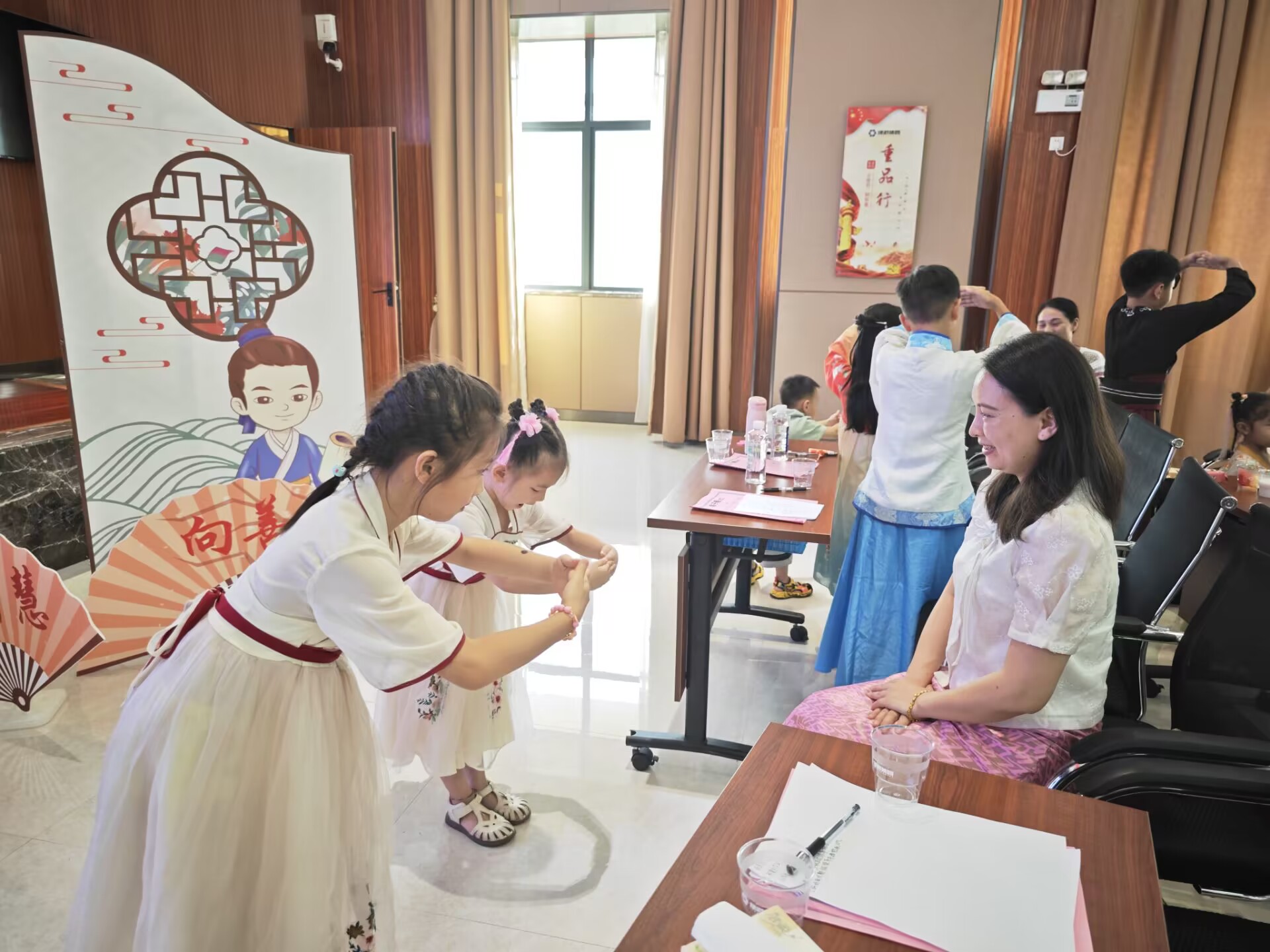 活動(dòng)以傳統(tǒng)禮儀的學(xué)習(xí)和體驗(yàn)為主題,此次培訓(xùn)邀請了廣西經(jīng)貿(mào)職業(yè)技術(shù)學(xué)院智慧商務(wù)產(chǎn)業(yè)學(xué)院的老師韋斯斯講授少兒禮儀知識。活動(dòng)中,韋老師向孩子們講解了《弟子規(guī)》中學(xué)習(xí)的重要、做人的道理以及待人接物的禮貌常識,讓大家更好地理解傳統(tǒng)的禮儀。韋老師親身示范,教授大家如何正確行認(rèn)知禮儀、家庭禮儀、餐桌禮儀、待客禮儀、交往禮儀、入泮禮、作揖禮、孝道禮儀等,在抬手躬身中感受禮儀之邦的古韻,學(xué)習(xí)尊師重教的品德。韋老師結(jié)合理論知識學(xué)習(xí),邀請孩子們上臺實(shí)操演練,模擬情景表演、開展親子互動(dòng)小游戲等,孩子們紛紛上臺,為大家展示,將學(xué)到的文明禮儀知識落實(shí)到行動(dòng)中,培訓(xùn)現(xiàn)場生動(dòng)形象、氣氛熱烈,孩子們?nèi)褙炞⒙犎±蠋煹闹v解,依照老師的示范,認(rèn)真的學(xué)習(xí)禮儀,體驗(yàn)傳統(tǒng)禮儀。